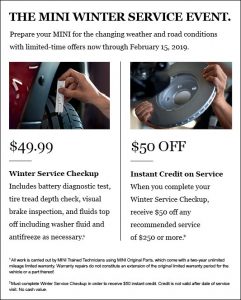 Prepare your MINI for the winter weather and read conditions with limited-time offers now through February 15, 2019.
