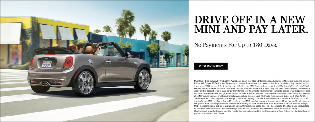 No payments for up to 180 days on a New MINI. We can come to your home, Call us today for a safe and touchless test drive and delivery within 30 miles of our store.