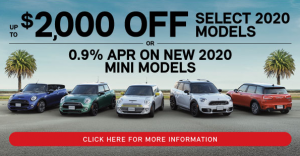 Receive up to $2,000 off select 2020 models or 0.9% APR on new 2020 MINI models. Click here to browse our inventory.