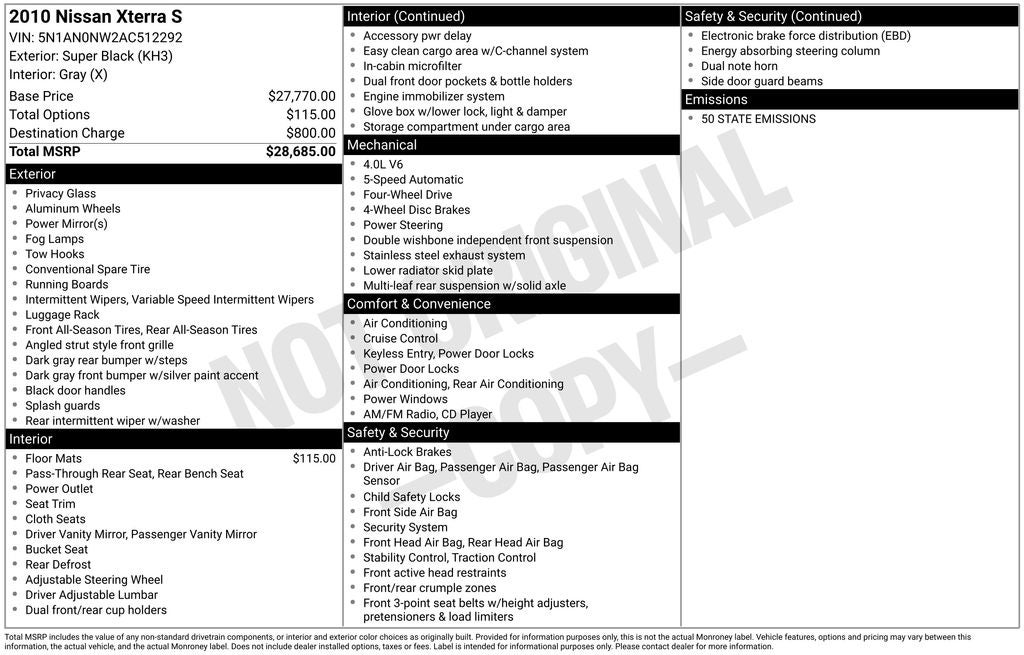 2010 Nissan Xterra S 4WD, Super Black Metallic Exterior with Gray Interior.