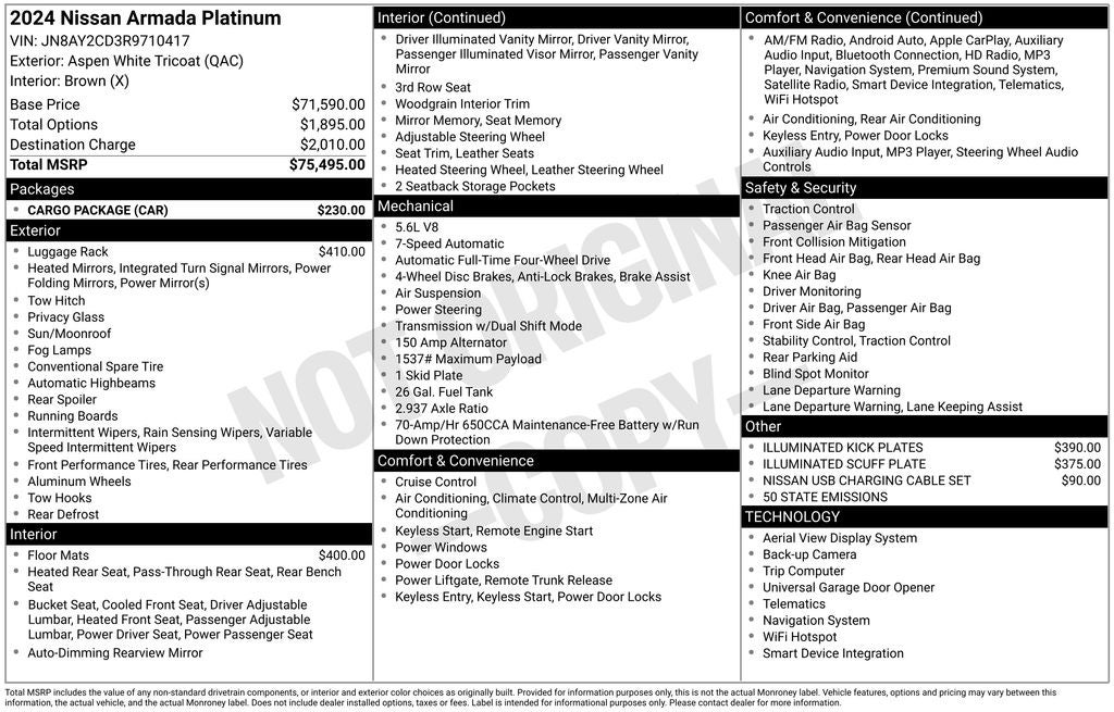 Certified. 2024 Nissan Armada Platinum Aspen White Tricoat 4WD 5.6L V8 DOHC 32V LEV3-ULEV125 400hp 7-Speed Automatic
